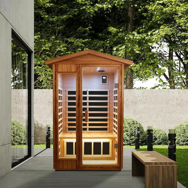1-Person Indoor/Outdoor Wood Infrared Sauna Khaya Wood Sauna Room with LED Lighting in Natural Wood Finish