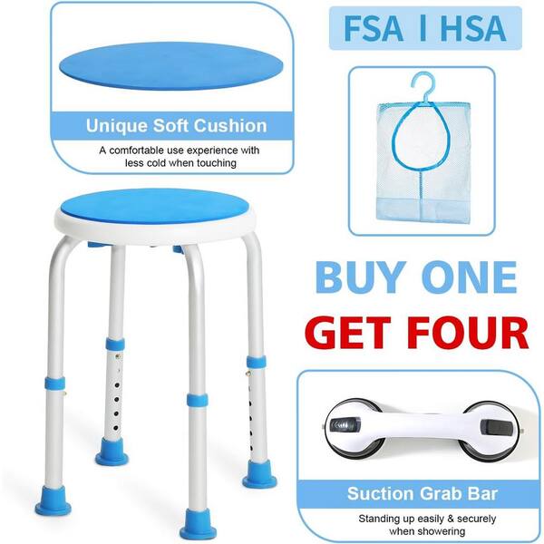 12.4 in. Aluminum Round Shower Chair Stool with Adjustable Height, Assist Grab Bar and Toiletry Bag in Blue