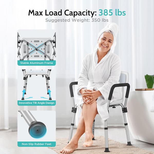 20.5 in. Aluminum Shower Chair for Elderly and Disabled with Arms, Back and 6 Adjustable Height in White