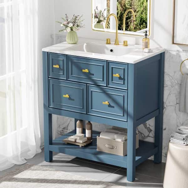 30 in. Freestanding Blue Bath Vanity with White Ceramic Sink Top Combo, 5 Drawers and Solid Wood Frame