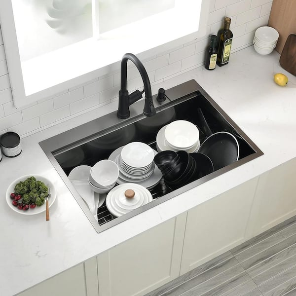 33 in. Drop-In Single Bowl 16G Gray Stainless Steel Kitchen Sink with Workstation, Drainer, Cutting Board and Strainer