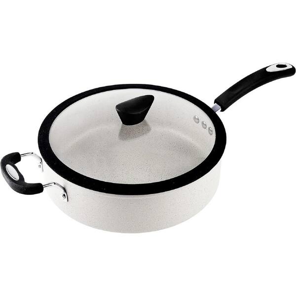 5.3 qt. Stone Layered with Aluminum Core Nonstick Sauce Pan in Warm Alabaster with Silicone Coated Handle and Glass Lid