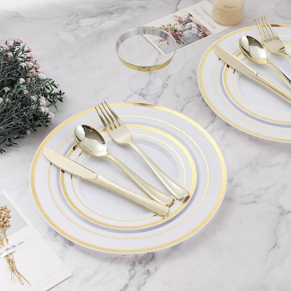 Gold Disposable Dinnerware Set for 100-Guests, 600-Piece Plastic Plates, Cups, Cutlery