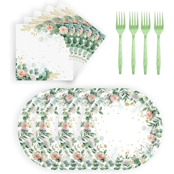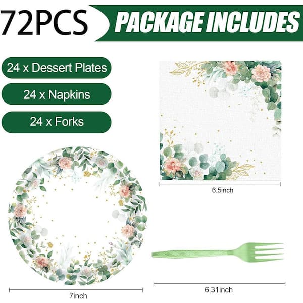 Sage Green Disposable Floral Paper Plates and Napkins Set (72 Pcs)