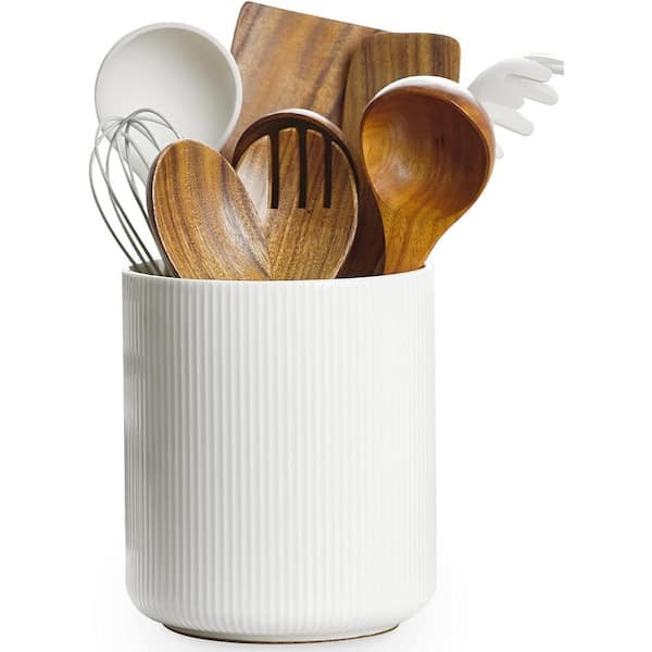White Ceramic Large Cooking Utensil Holder with Cork Mat Kitchen Decor and Counter