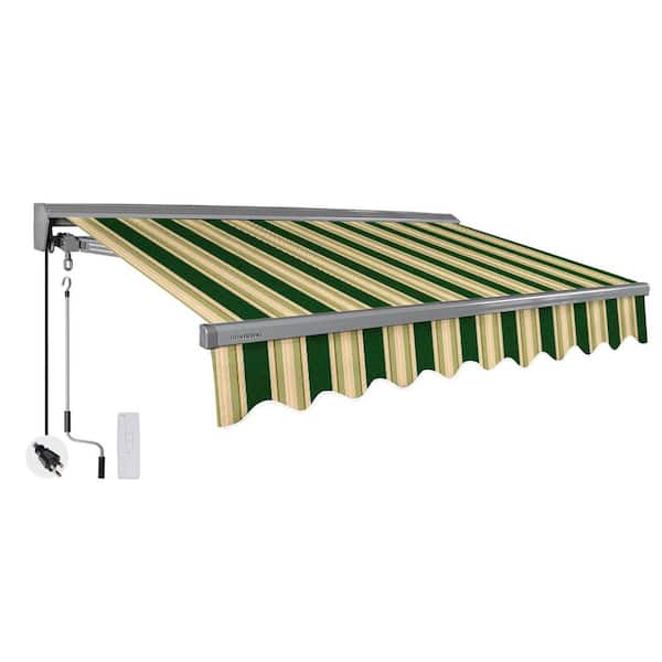 12 ft. Classic Series Semi-Cassette Electric w/ Remote Retractable Patio Awning, Green Beige Stripes (10 ft Projection)
