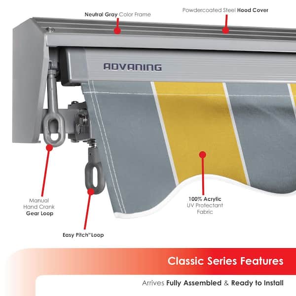 12 ft. Classic Series Semi-Cassette Electric w/ Remote Retractable Patio Awning, Yellow Gray Stripes (10 ft Projection)