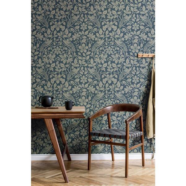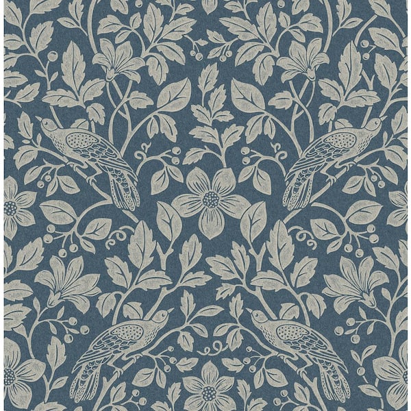 Dark Blue Marlow Bird Vine Wallpaper Sample