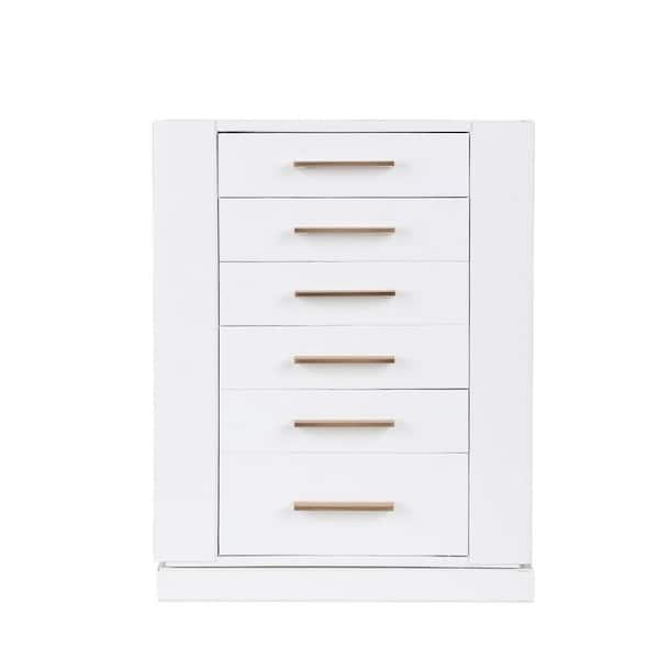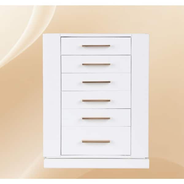 11.3 in. White Rectangle Wood Jewelry Box, Vertical 360° Rotating Leather Jewelry Organizer with 6-Drawers