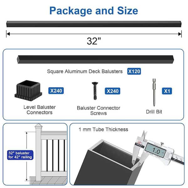 120 Pack 32 x 3/4 Aluminum Square Deck Balusters Black Spindles with Anti-UV Connectors for Railing System