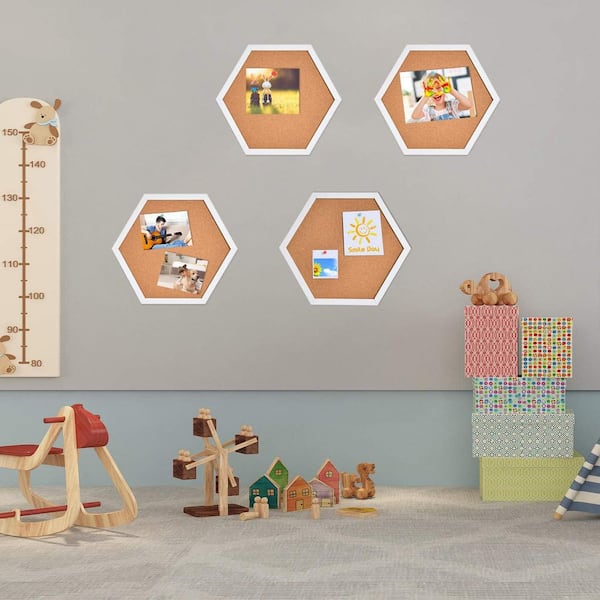 13.5 x 11 Hexagon White Cork Bulletin Board Tiles Small Framed Decorative Display Boards for Home Office School 4-Pack