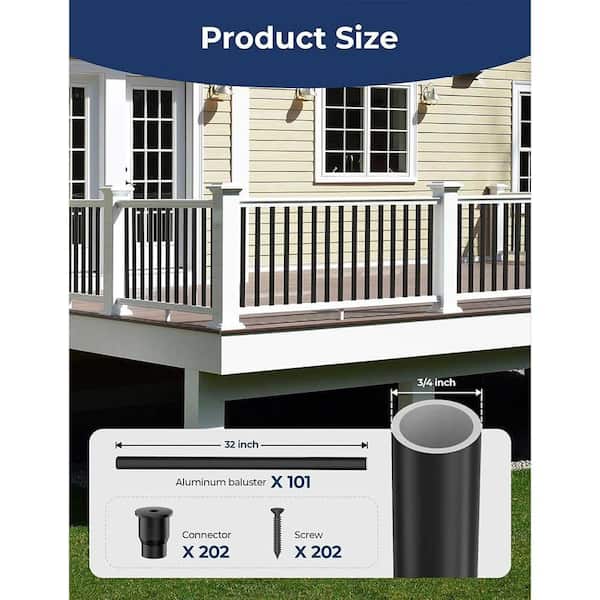 32 Round Aluminum Deck Balusters Black Staircase Spindles with Connectors for Outdoor Porch Railings 101-Pack 0.75" W