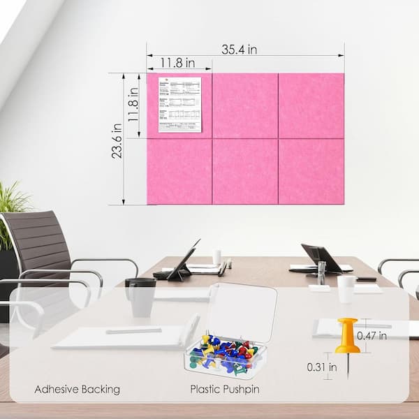 36 x 24 Pink Felt Cork Board Tiles 6-Pack with Pushpins for Office Pin Board Sound Insulation and Noise Reduction