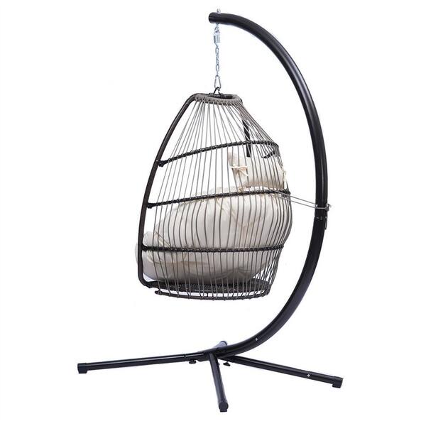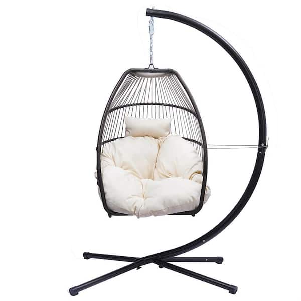45 in. 1-Person Black Wicker Patio Hanging Swing Hammock Egg Chair with Beige Cushion Pillow and C Type Bracket