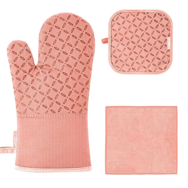 6Pcs Oven Mitts and Pot Holders with High Heat Resistant 500° and Non-Slip Silicon Surface for Cooking in Pink