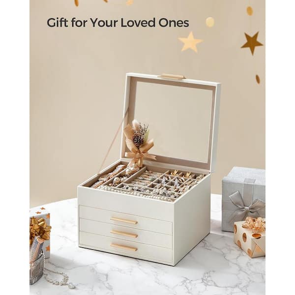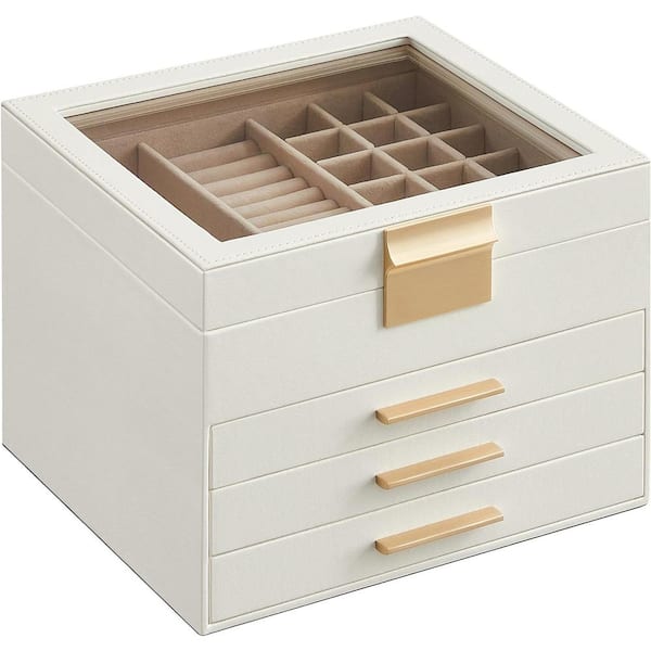 9.1 x 8 x 6.5 in. Cloud White MDF Jewelry Box with Glass Lid, 4-Layer Organizer, 3 Drawer, for Big and Small Jewelry