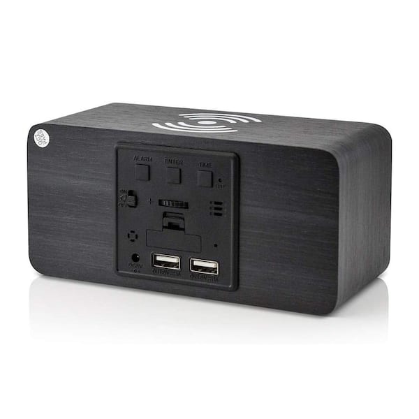 Black LED Digital Alarm Clock with Qi Wireless Charging, Sound Control, Date, Temperature Display, Table Clock
