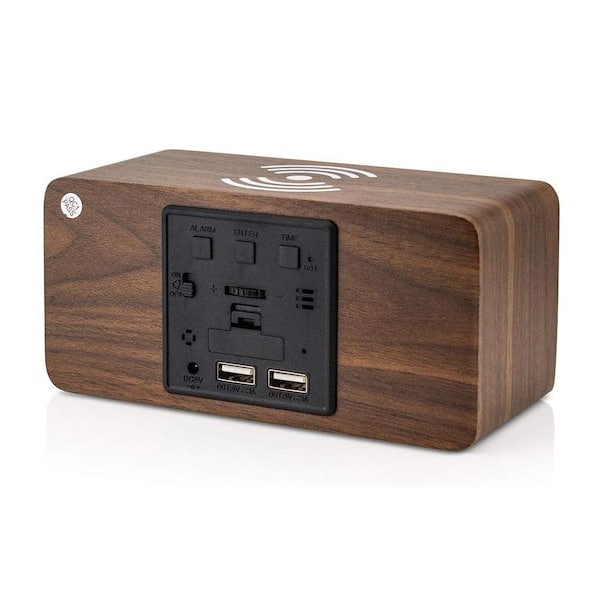 Brown LED Digital Alarm Clock with Qi Wireless Charging, Sound Control, Date, Temperature Display, Table Clock