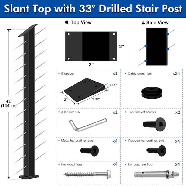 Stainless Steel 42 in. Cable Railing Stair Post with Cable Grommet, 5-Deg. Spacers Fit for 28-38 Deg. Stairway (1-Pack)
