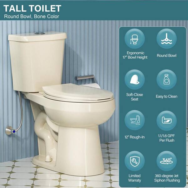 17 in. Toilet ADA Chair Height Two-Piece Toilet 1.1/1.6 GPF Dual Flush Round Toilet in Bone With Soft-Close Seat Toilet