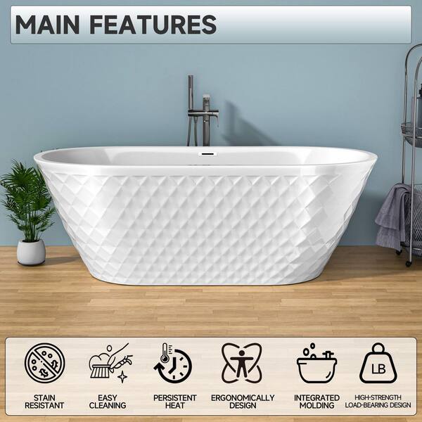 67 in. x 31.5 in. Acrylic Freestanding Soaking Bathtub with Diamond Wave Pattern in White with Chrome Drain and Overflow