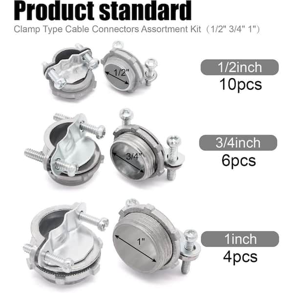 1/2 in. 3/4 in. 1 in. Zinc Alloy Clamp Type Cable Connectors Assortment Kit Romex Cable Compatibility Silver (20-Pack)