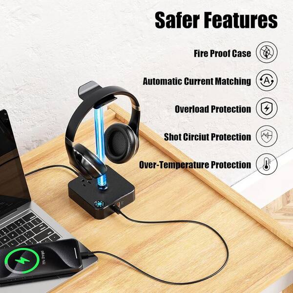2-Outlet Gaming Headset Holder Hanger with 3 USB Port and Multi-Lights LED in Black