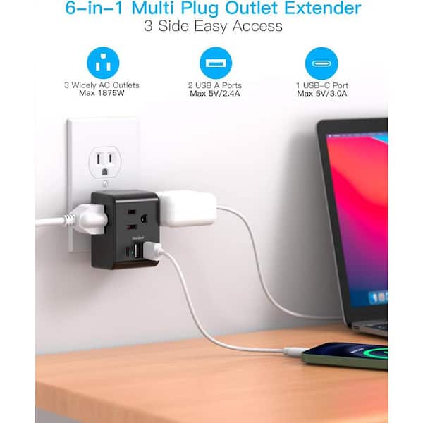 3-Outlet Wall Extender Splitter with 3 USB Wall Port in Black
