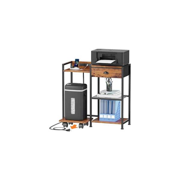3 Tier Industrial Printer Stand with Storage Drawer Charging Station USB Port Shelf Shredder Stand Wheels Rustic Brown
