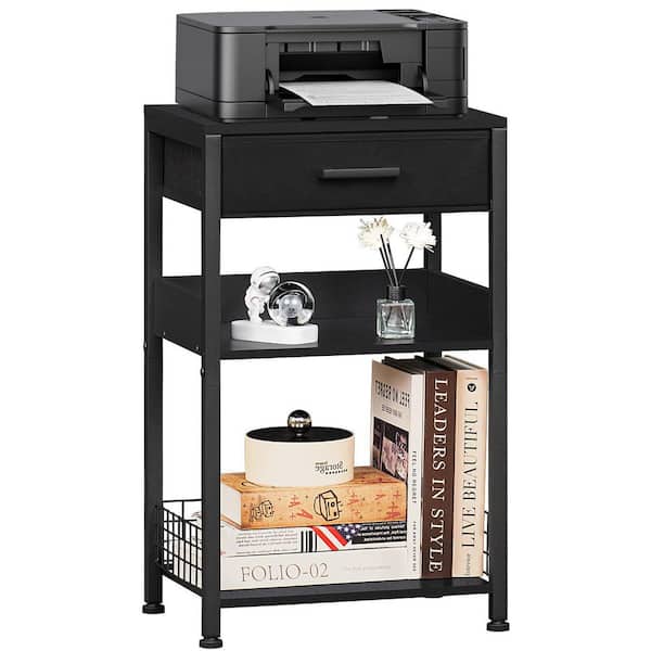 3 Tier Industrial Wood Printer Table with Fabric Drawer Tall End Table Nightstand Storage Shelf Pure Black