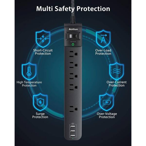 5-Outlet Power Strip Surge Protector with Switch, 3-USB Ports and 6 ft. Braided Extension Cord in Black (2 Packs)