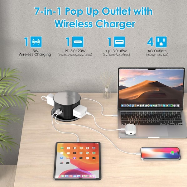 6 FT Extension Cord 4-Outlet Pop-up Surge Protector Outlet in Black with 15-Watt Wireless Charger and 20-Watt USB Ports
