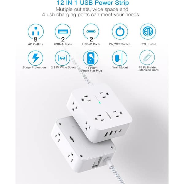 8-Outlet Power Strip Surge Protector with 4-USB (2-USB C) and 15 ft. Braided Extension Cord Flat Plug in White