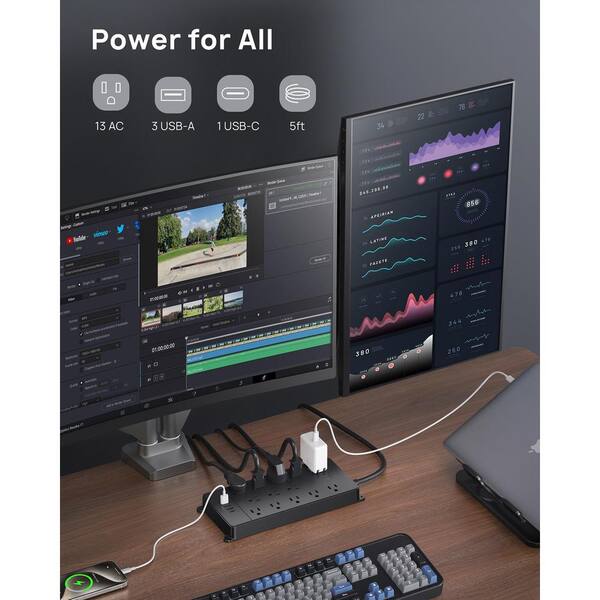 Mountable Heavy Duty 5 ft. Power Strip Extension Cord 13-Outlet AC 4000-Joules Surge Protector with 4-USB Ports 1-USB C