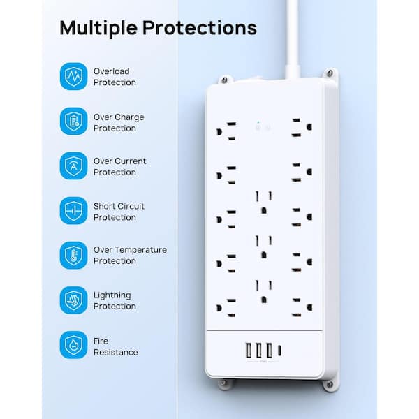Mountable Heavy Duty 5 ft. Power Strip Extension Cord 13-Outlet AC 4000-Joules Surge Protector with 4-USB Ports 1-USB C