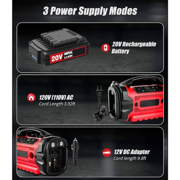 Portable Electric Air Compressor 3 Power Sources 110V AC 12V DC 20V Battery Inflation Deflation Modes Dual Motors