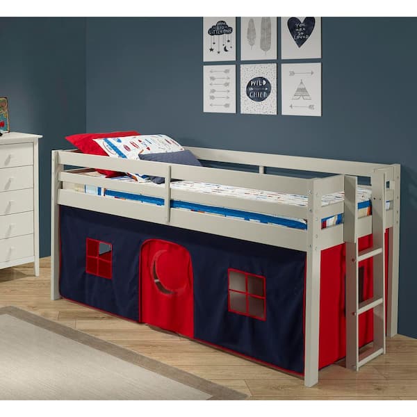 Jasper Twin Junior Loft Bed, Dove Gray Frame and Blue/Red Playhouse Tent