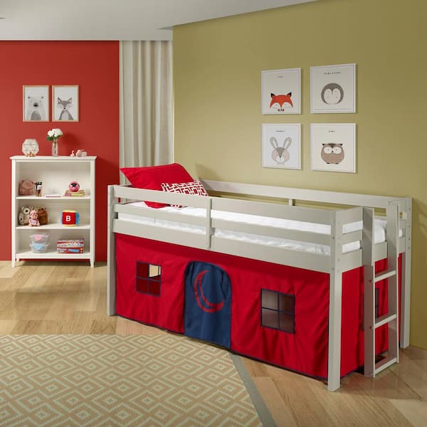 Jasper Twin Junior Loft Bed, Dove Gray Frame and Red/Blue Bottom Playhouse Tent