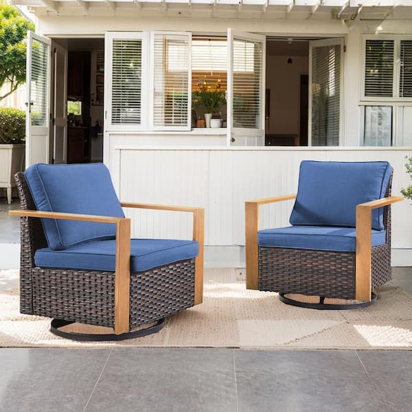 Allcot Brown Wicker Patio Swivel Chair Set Outdoor Rocking Chair with CushionGuard Blue Cushions (2-Pack)