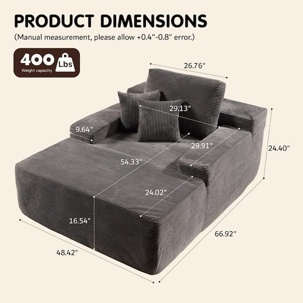 JOJO 67 in. Wide Square Arm Corduroy Modern Rectangle Lazy Sofa Chaise Lounge Couch with Pillows in Gray for Living Room