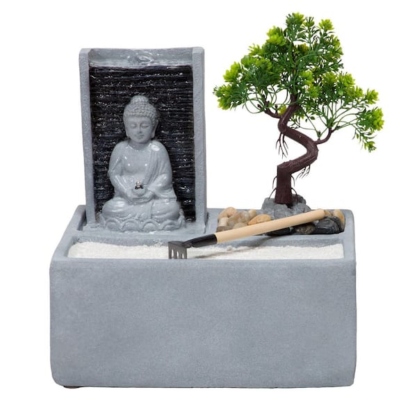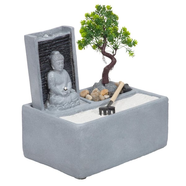 13 in. Tall Buddha Zen Garden Tabletop Waterfall Fountain with LED Light, Gray