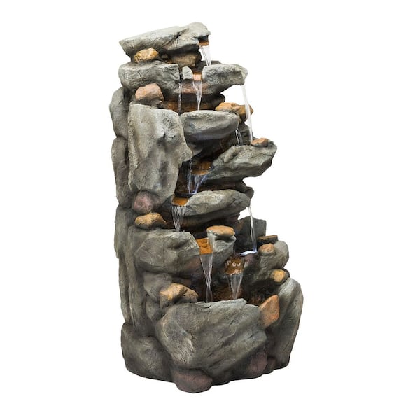 50 in. Tall Outdoor 8-Tier Rock Waterfall Fountain with LED Lights, Grey
