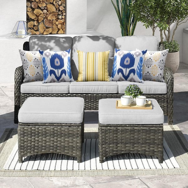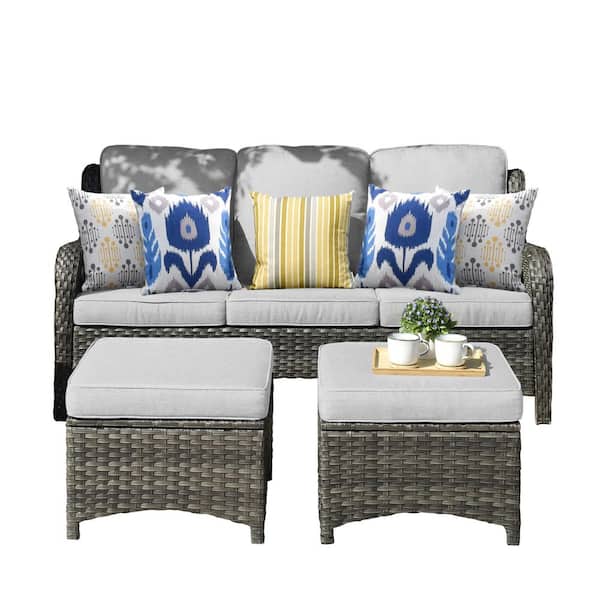 Alps Gray Wicker Outdoor Couch Patio Sofa with Gray Cushions and Ottoman