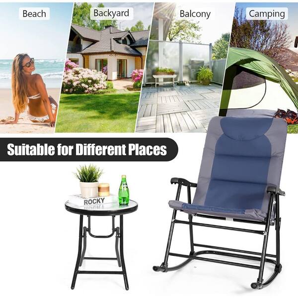 3-Piece Outdoor Folding Rocking Chair Conversation Set with Blue and Grey Cushion