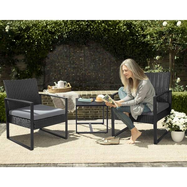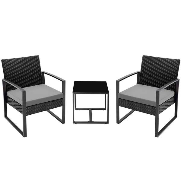 3-Piece Wicker Patio Conversation Set Bistro Furniture Set with Gray Cushions