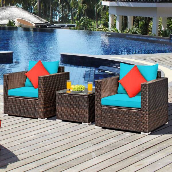 3-Piece Wicker Patio Conversation Set Sofa with Turquoise Cushions