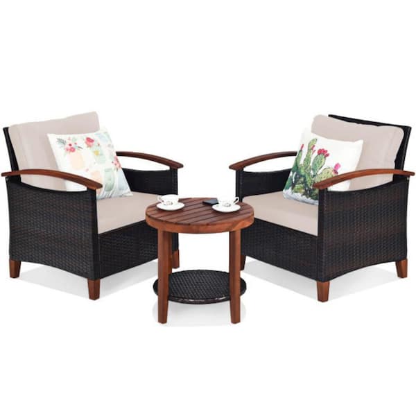 3-Pieces Wicker Outdoor Wooden Frame Patio Conversation Furniture Set with Beige Cushion