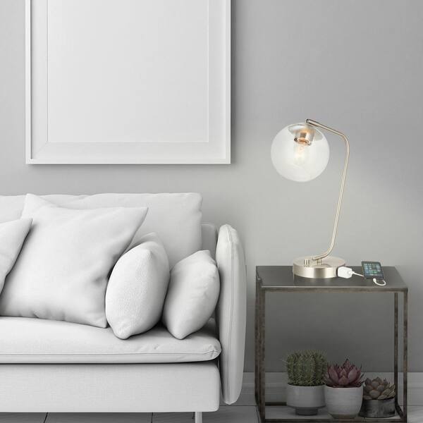 18 in. Brushed Nickel Desk Lamp with Clear Glass Shade and Power Outlet