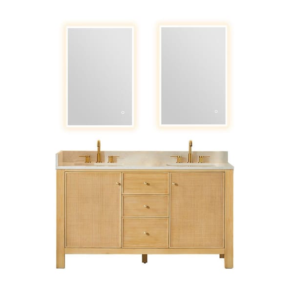 Cedar 60 in. Double Freestanding Natural Wood Bath Vanity with Grain White Engineered Stone Top Assembled, Mirror