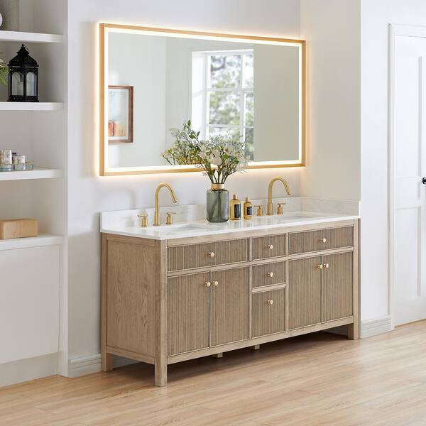 Cerrito 72" Double Sink Freestanding Nature Oak Bath Vanity with Grain White Engineered Stone Top Assembled and Mirror